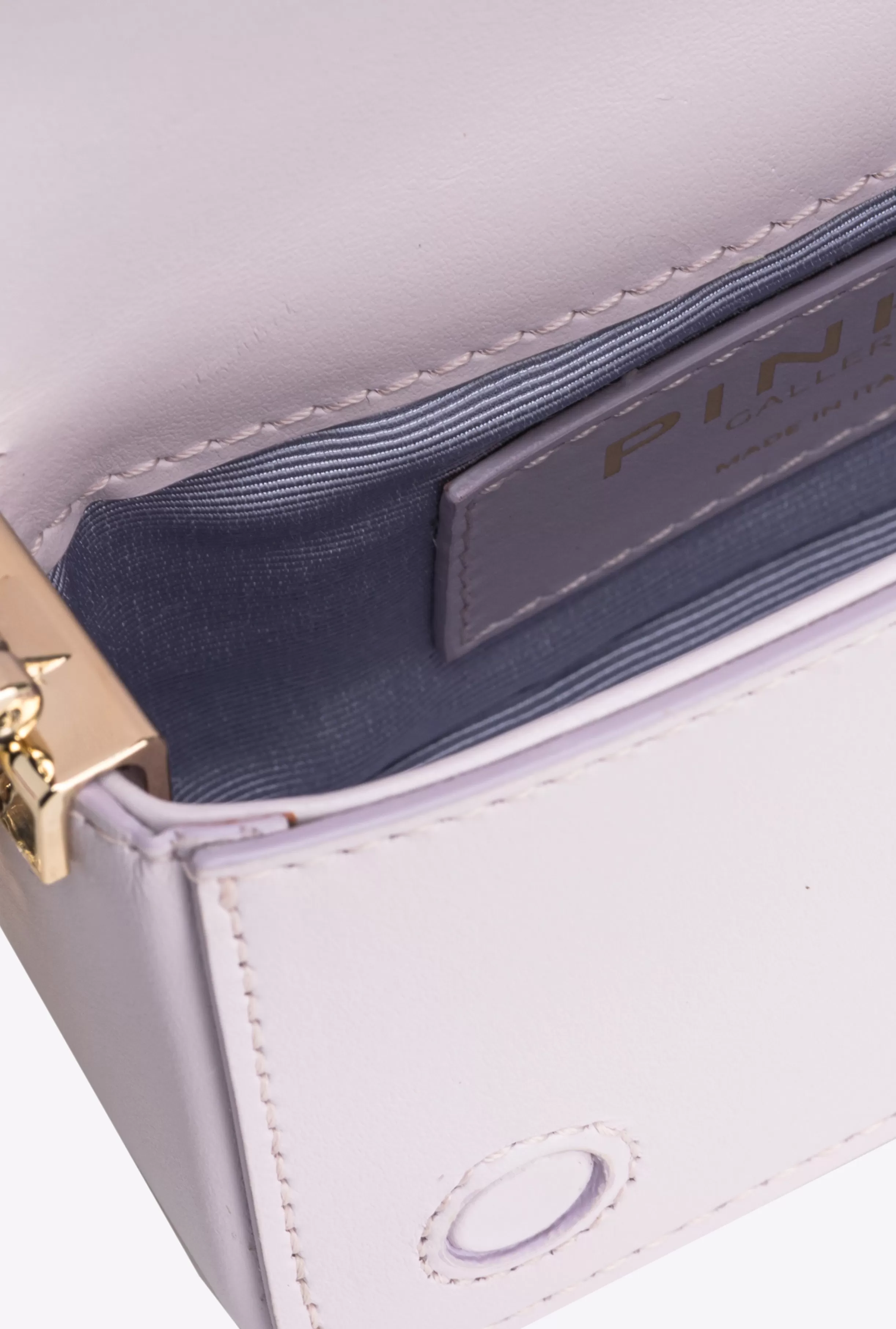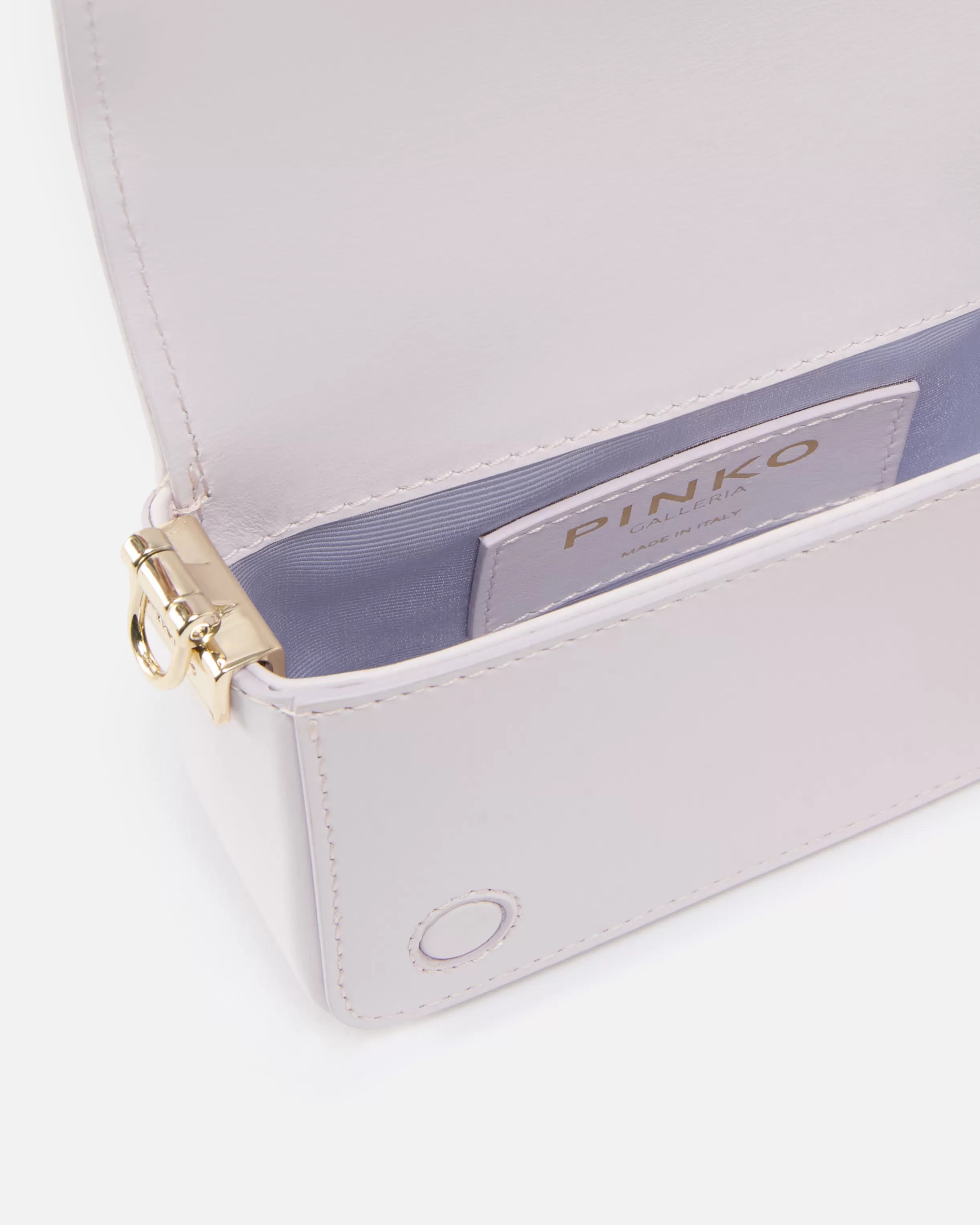 Micro Love Bag Click comprising imperfection-concealing brushed leather, in addition to suede which boasts a placed distinctive nuance, in line with the design created specifically by the PINKO team. All-over heat-transferred crystal appliqués: these comprise Europe-sourced round crystals with 8 ultra-bright facets, affixed in a secure and long-lasting way by means of the provided glue. The crystals – which come in four different sizes – are positioned, covered with a tissue and heat-pressed for several minutes. The concealed press-stud fastening is embellished by the iconic metal Love Birds Diamond Cut buckle with cut-out effect. The shoulder strap combines the classic round-link chain with a practical, adjustable leather pad. The bag is part of the Limited Edition special capsule collection which comprises PINKO Galleria-exclusive limited-edition models. Use the special NFC chip to enjoy a special experience, specific to the bag you have just bagged!