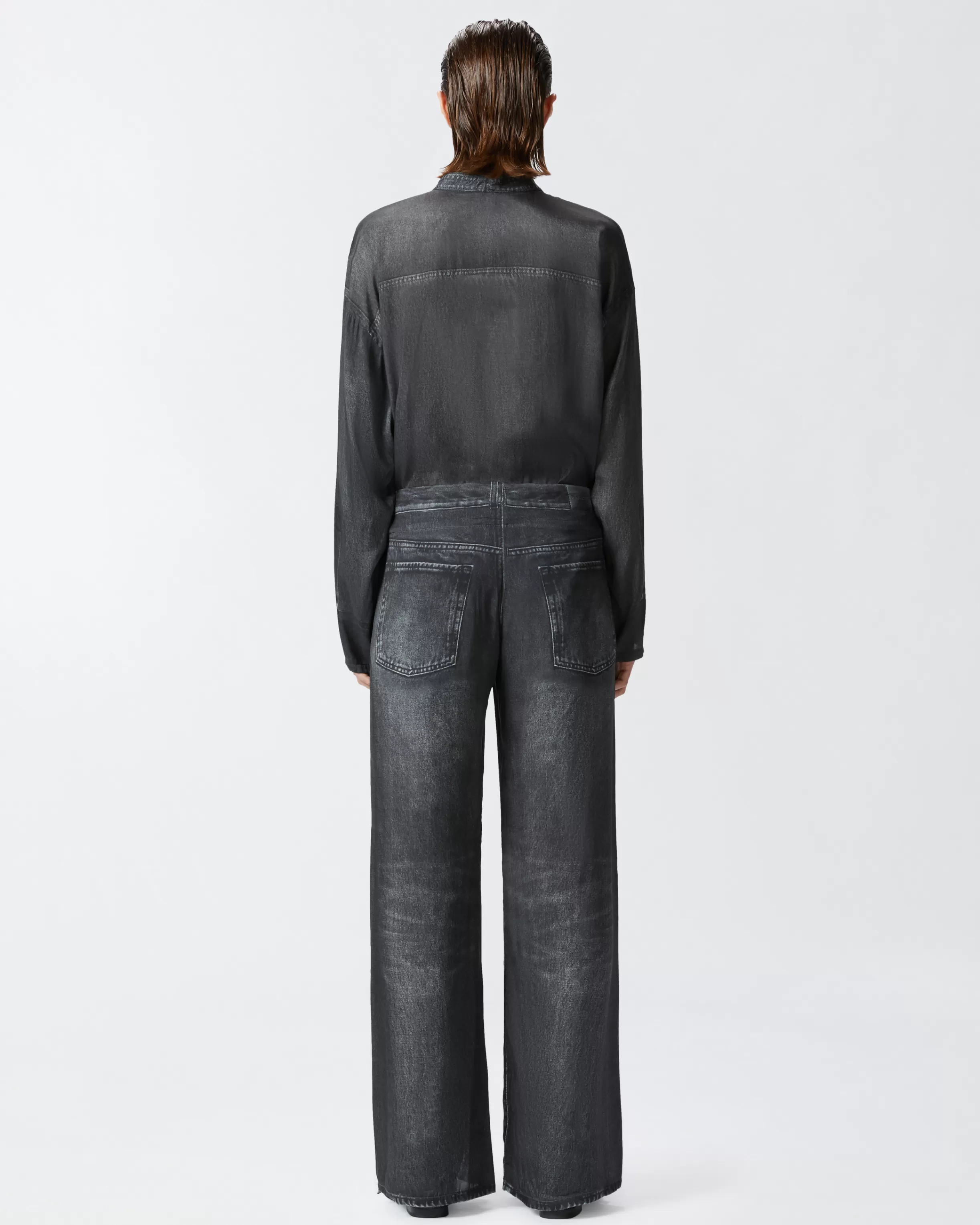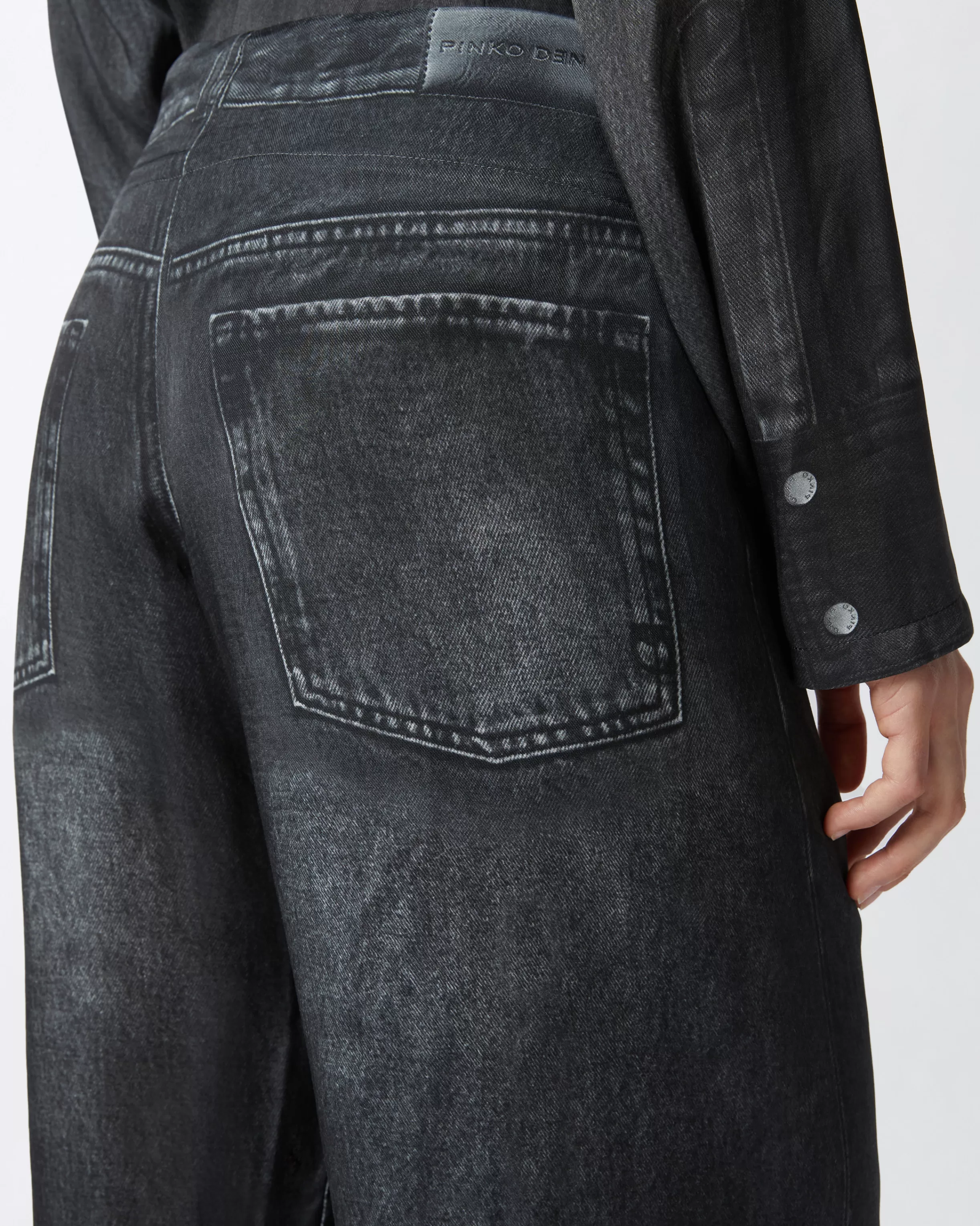 Wide-leg viscose twill trousers with distinctive trompe l’œil-effect print that mimics a pair of black jeans, including all its details like seams, pockets and buttons. Low waist and invisible zip fastening at the front.