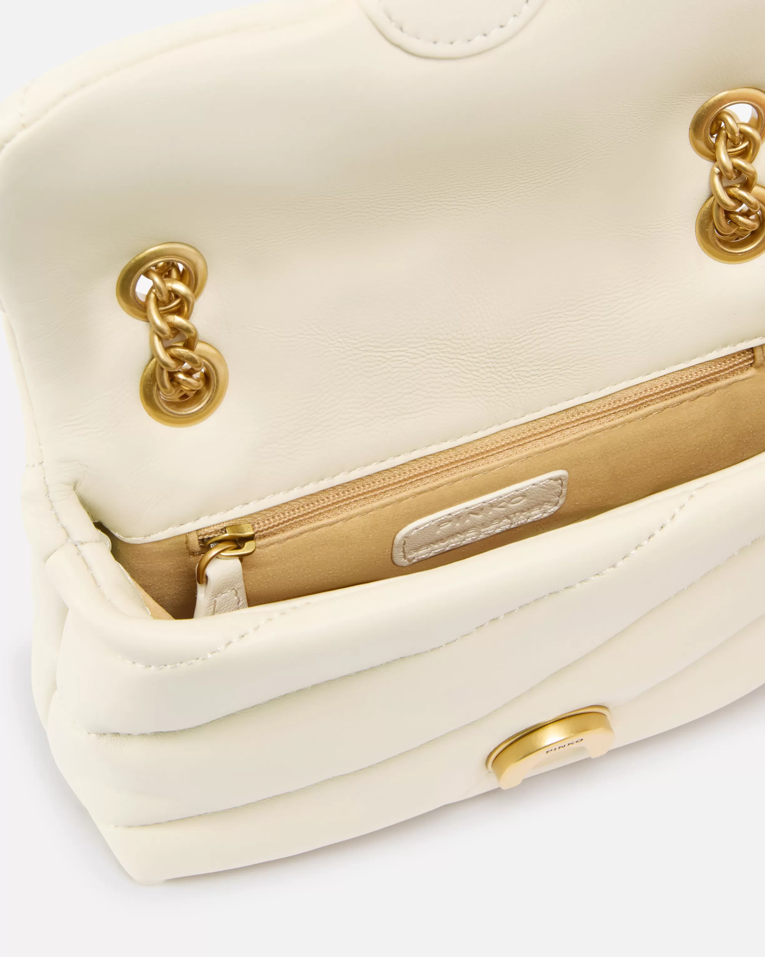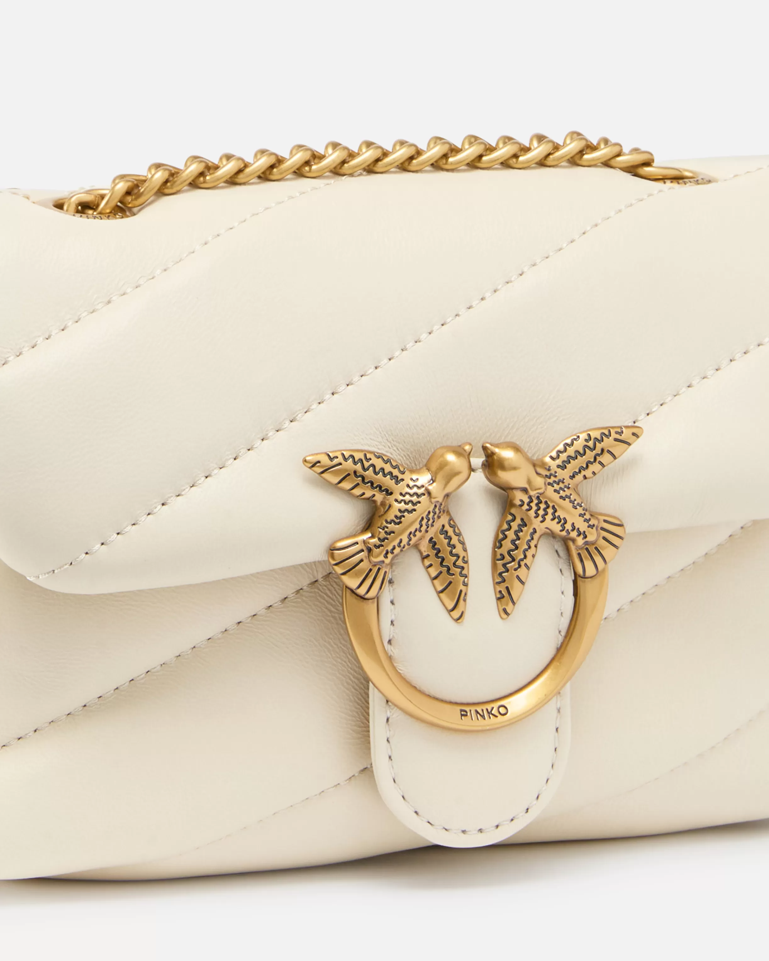 Baby Love Bag Puff in soft nappa leather with diagonal maxi quilting. The fastening is embellished with the iconic metal Love Birds Diamond Cut buckle. The accessory boasts a microsuede-lined interior and a zipped slip pocket. Complete with thin metal-chain shoulder strap.