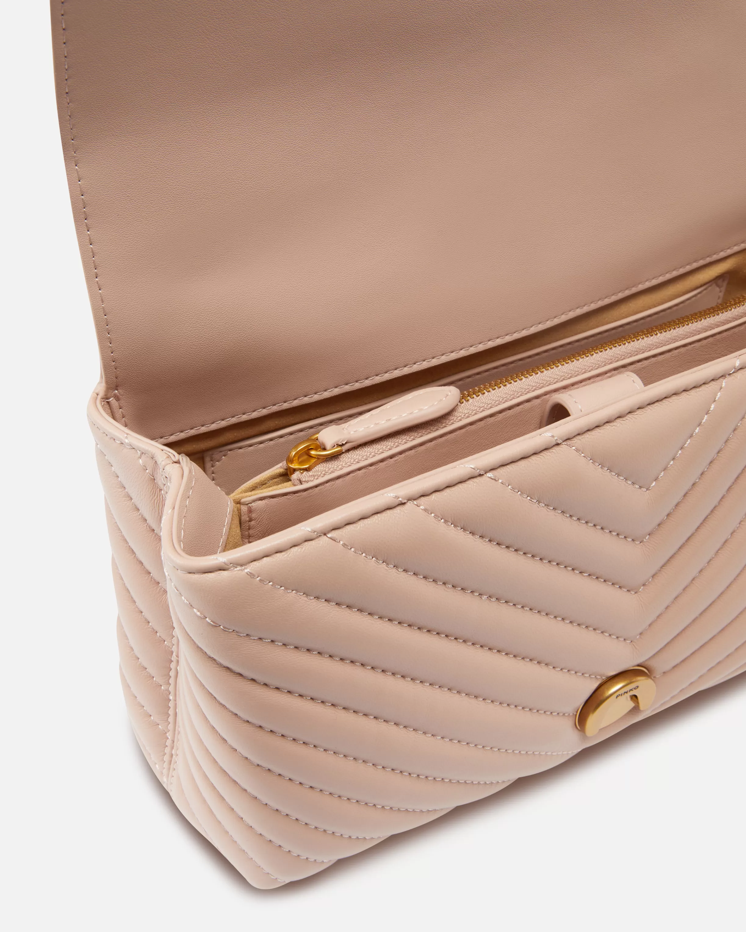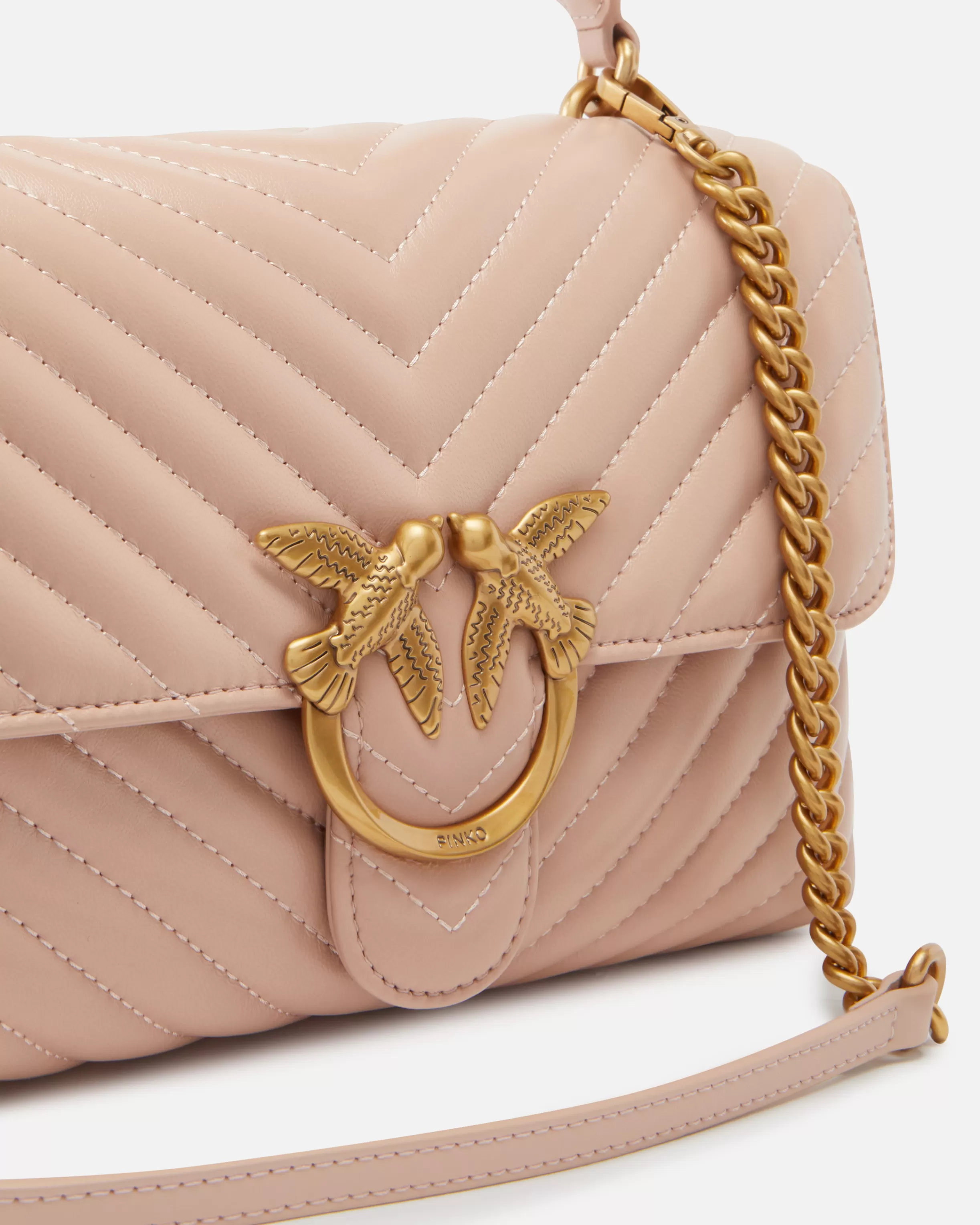 Classic Love Bag Puff in quilted nappa leather with chevron pattern. The fastening is embellished with the iconic metal Love Birds Diamond Cut buckle. The accessory boasts a microsuede-lined interior, complete with a zipped centre divider pocket and slip pocket. The shoulder strap combines the classic round metal chain with a practical, adjustable nappa leather pad.
