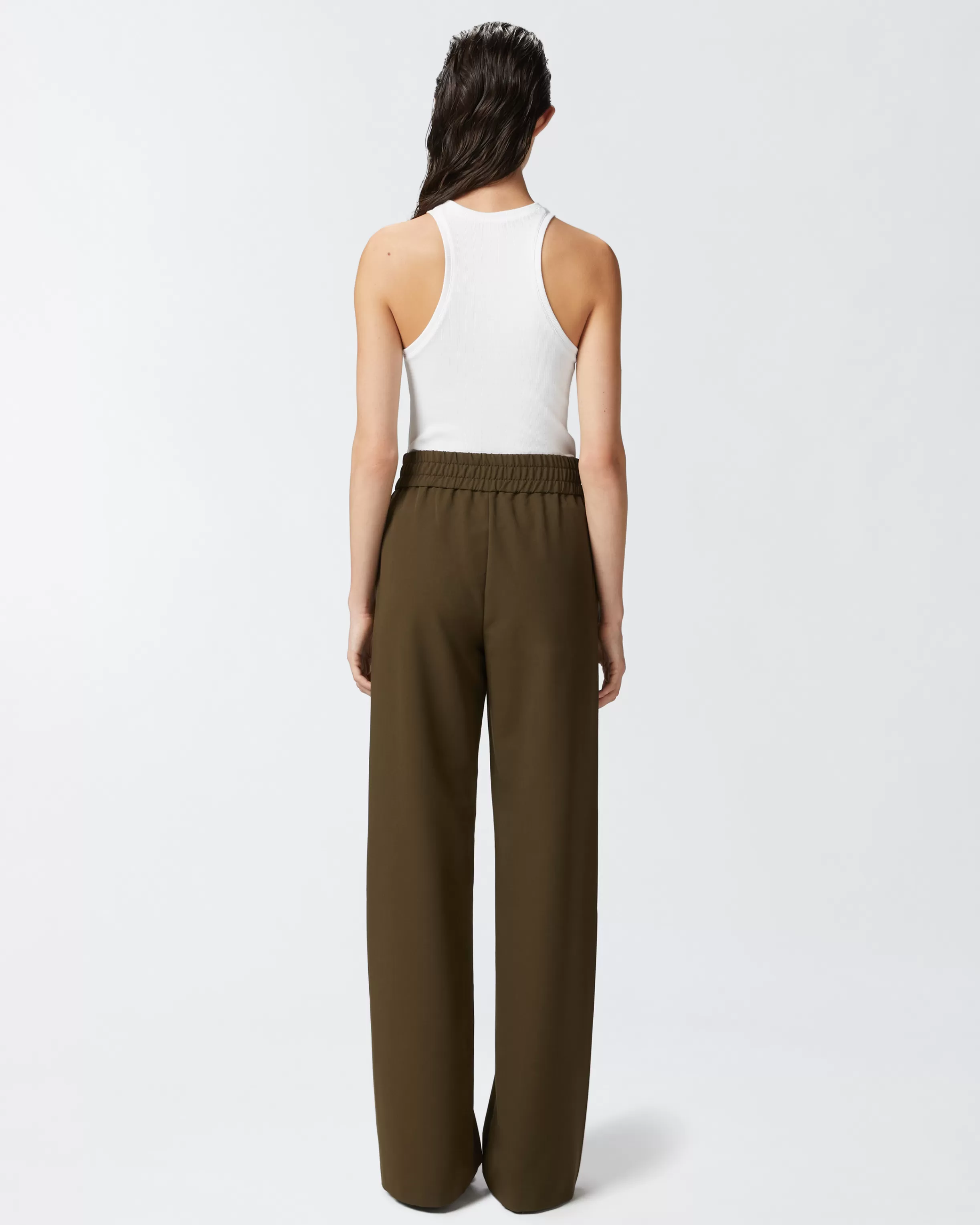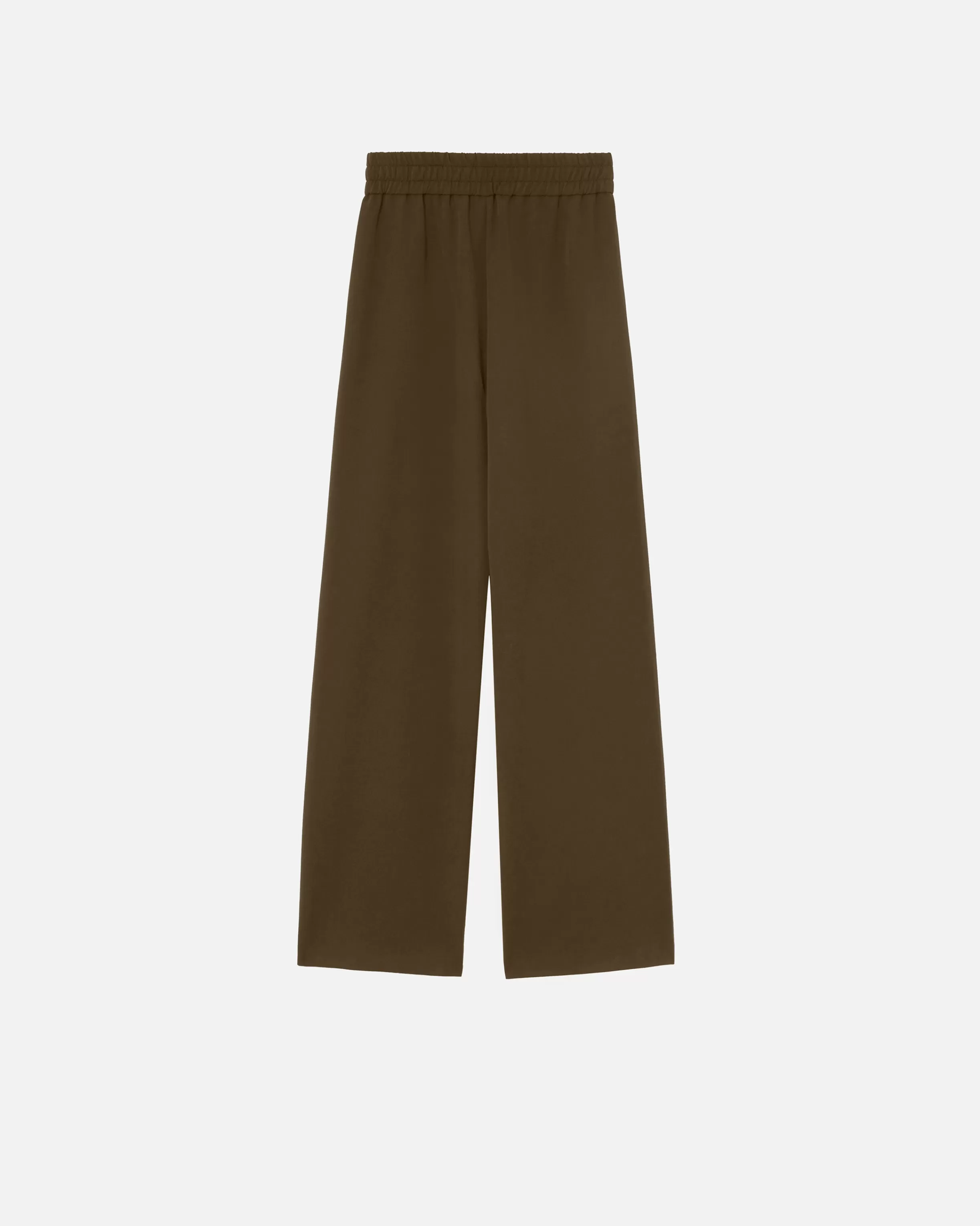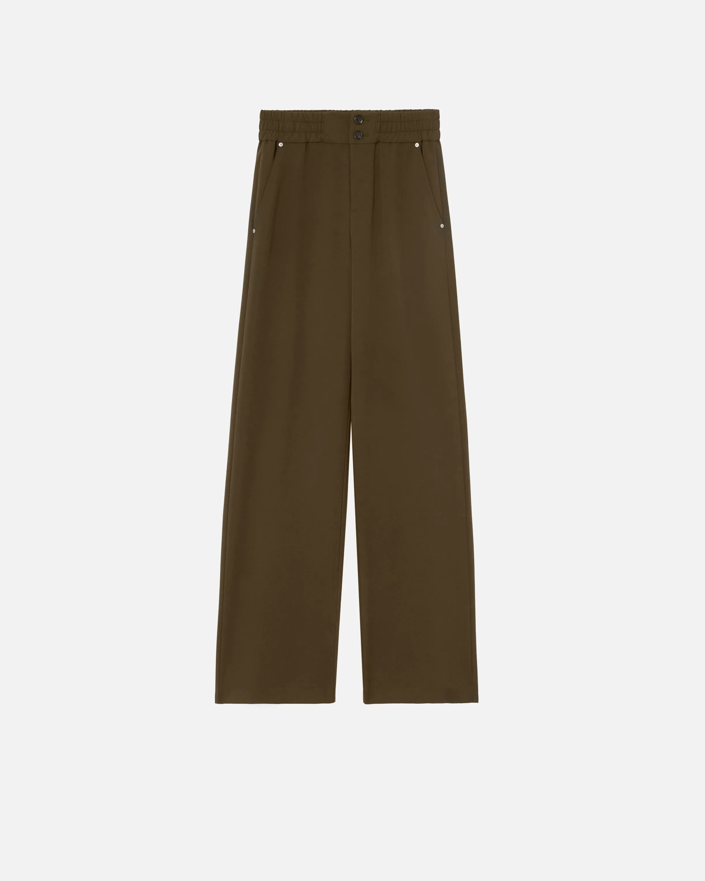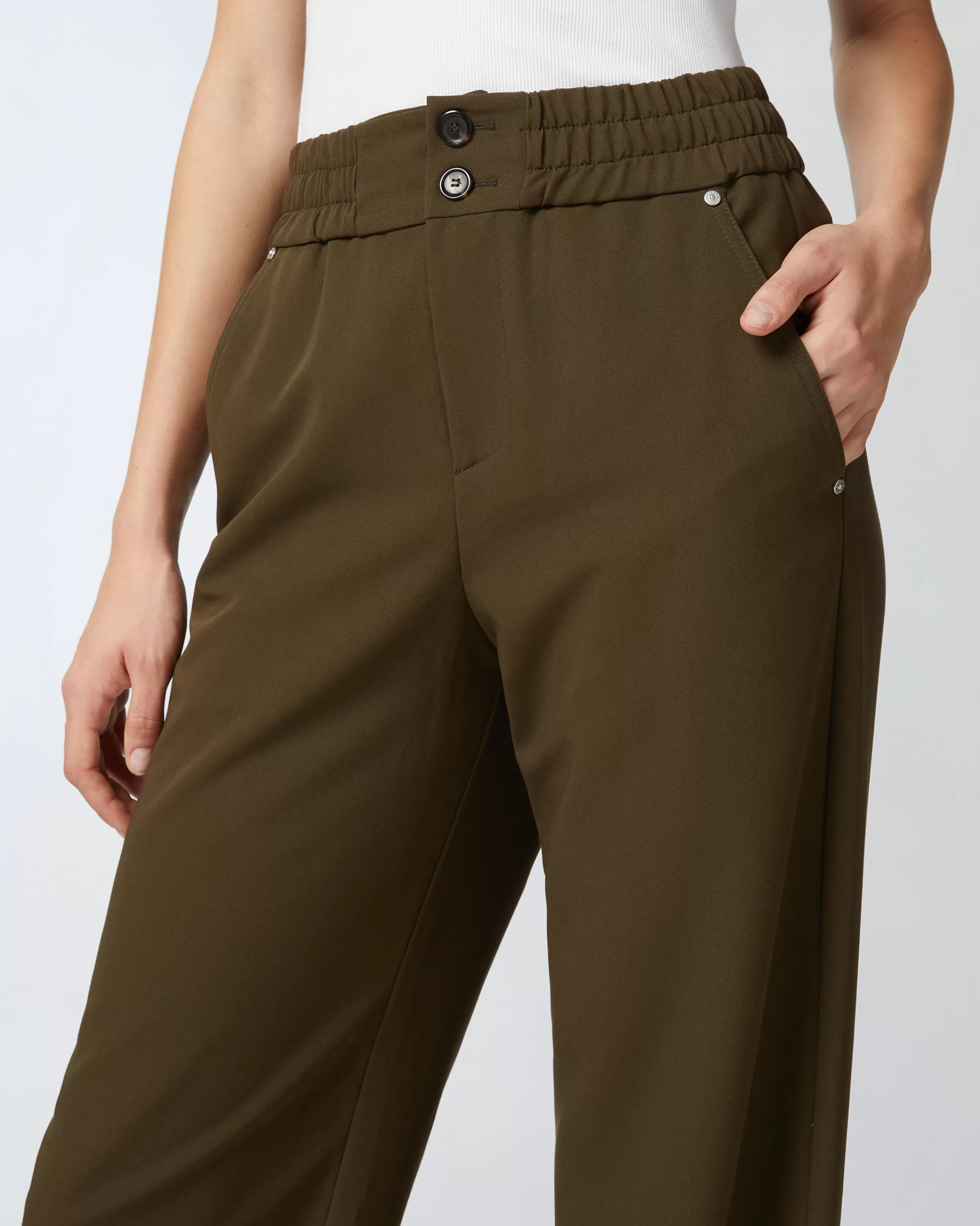 Women’s long trousers made of stretch viscose crepe fabric with a particularly fluid hand. The high waist is characterised by elastic and a gathered pattern, completed with belt loops. Straight, slightly wide leg, with French pockets on the hips. Zip and double-button fastening at the waist.