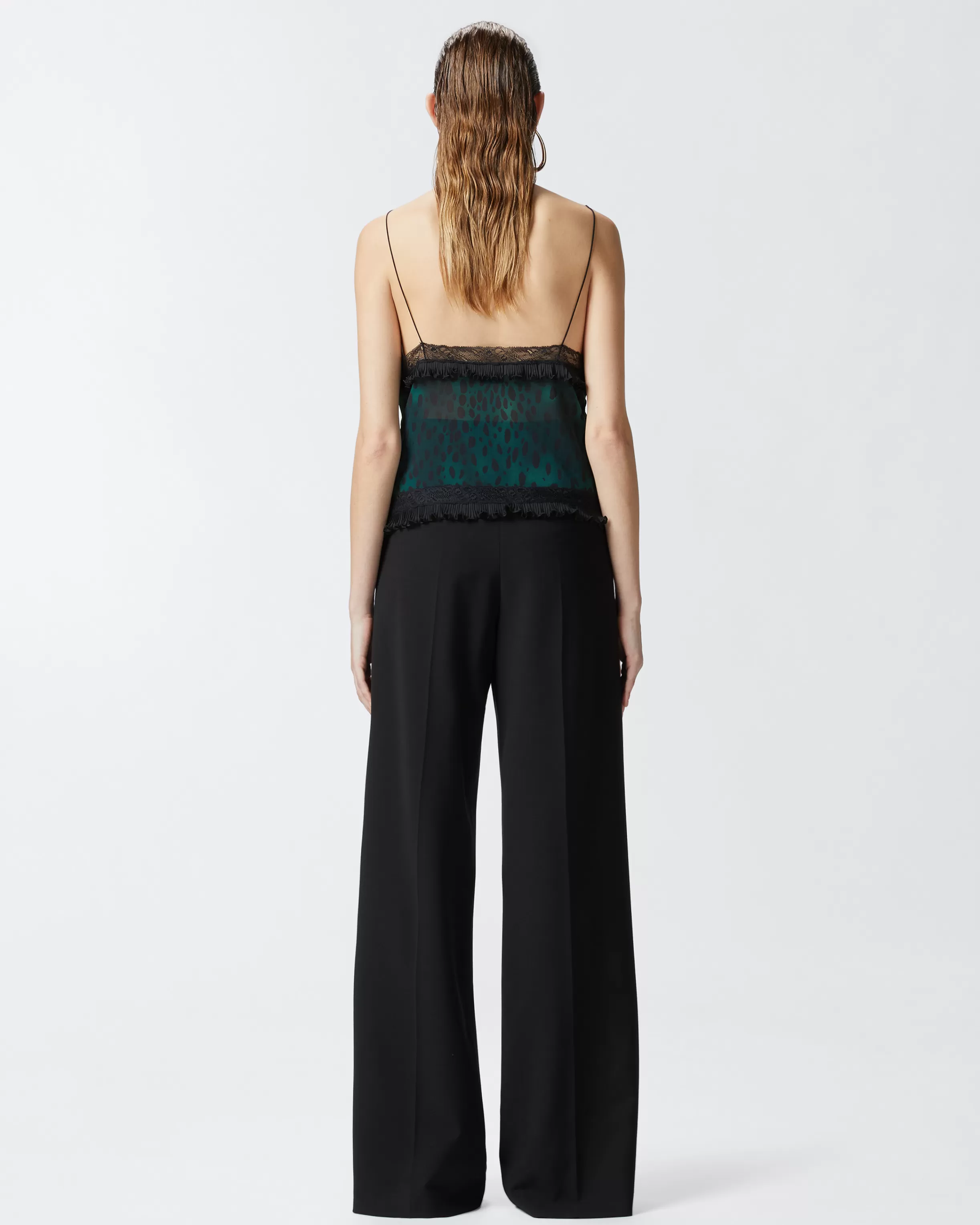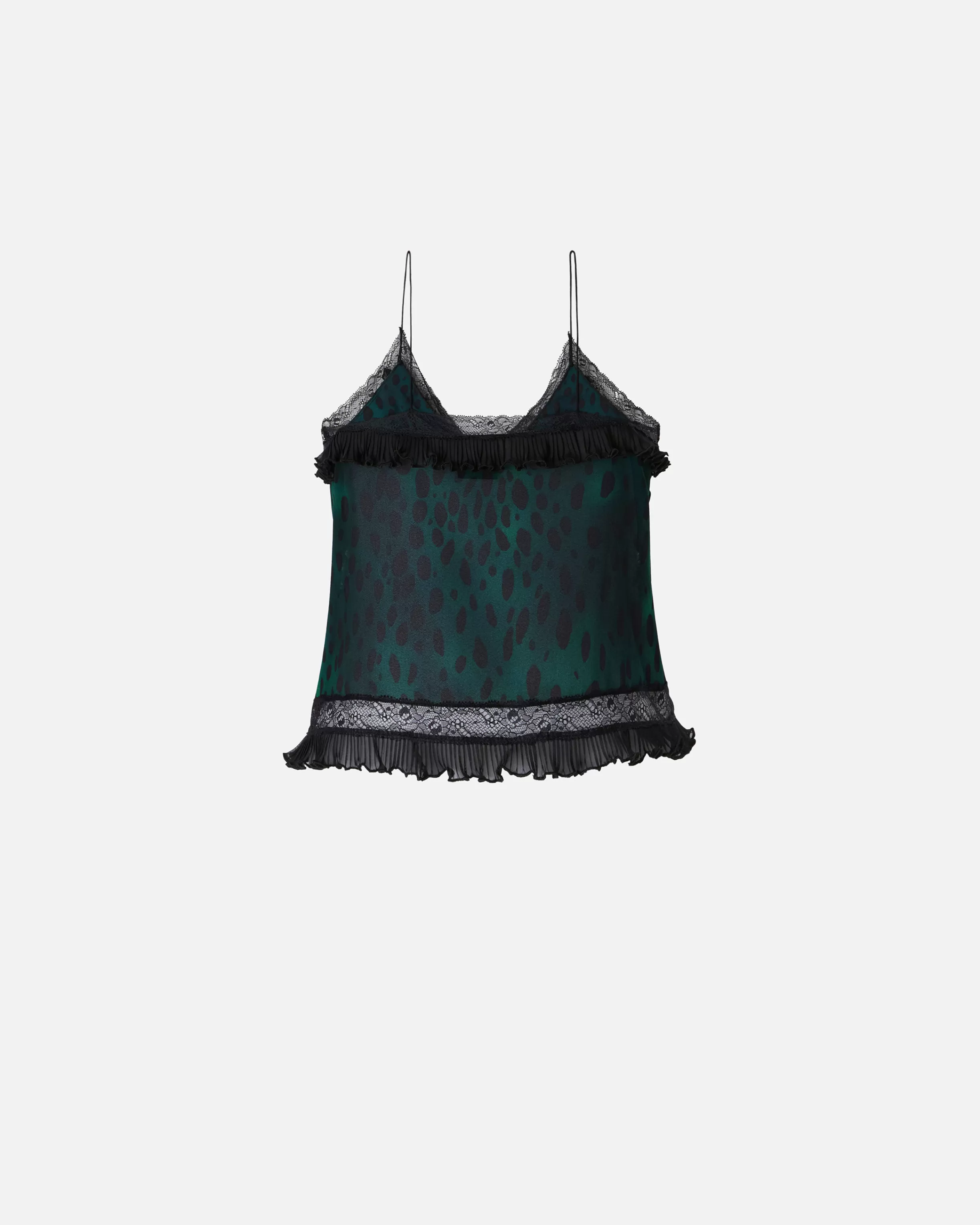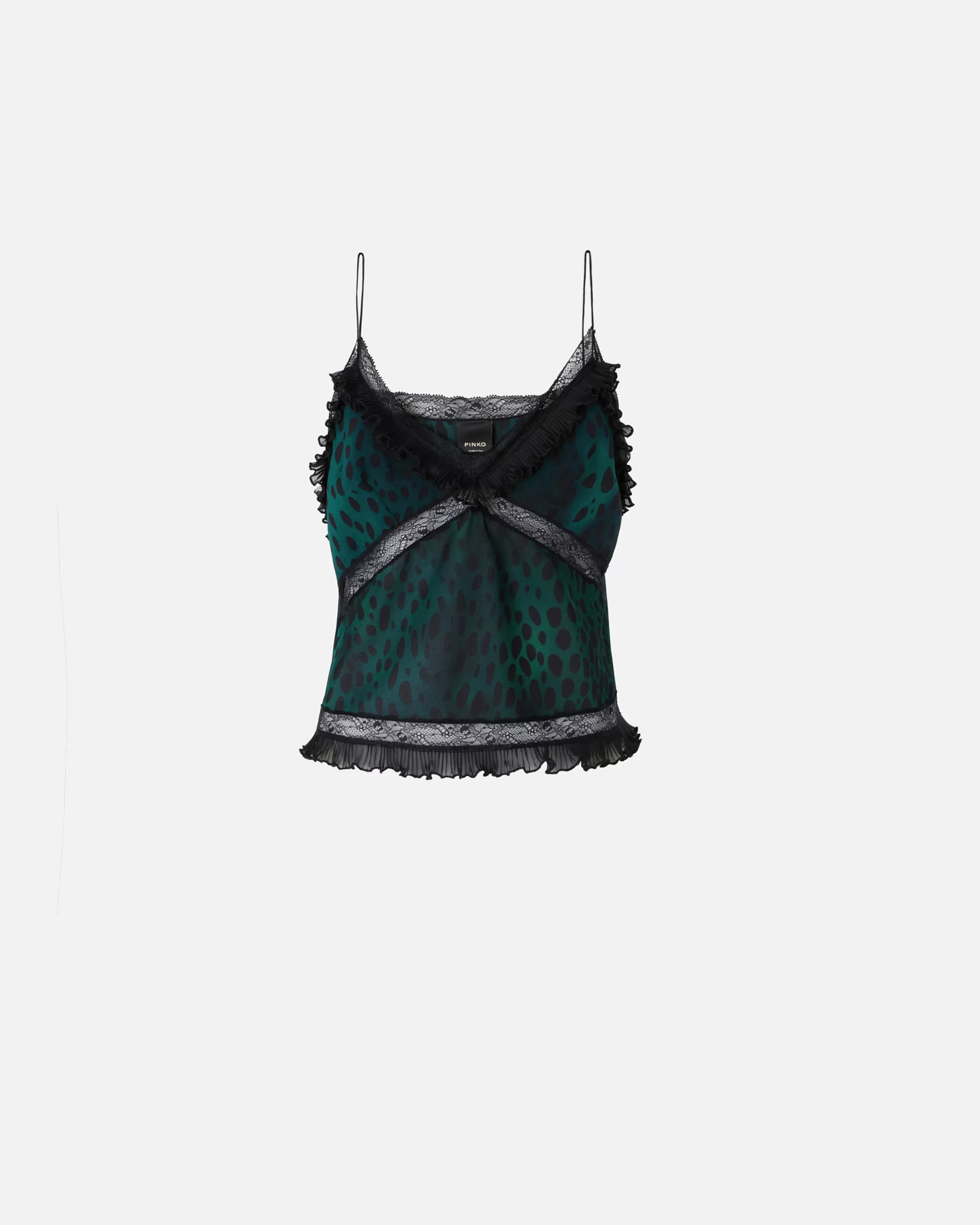 Sleeveless crop top in lightweight georgette with dotted animal print and lace trims and inserts. The V-neck with spaghetti straps and hem are embellished with a small pleated fabric flounce.