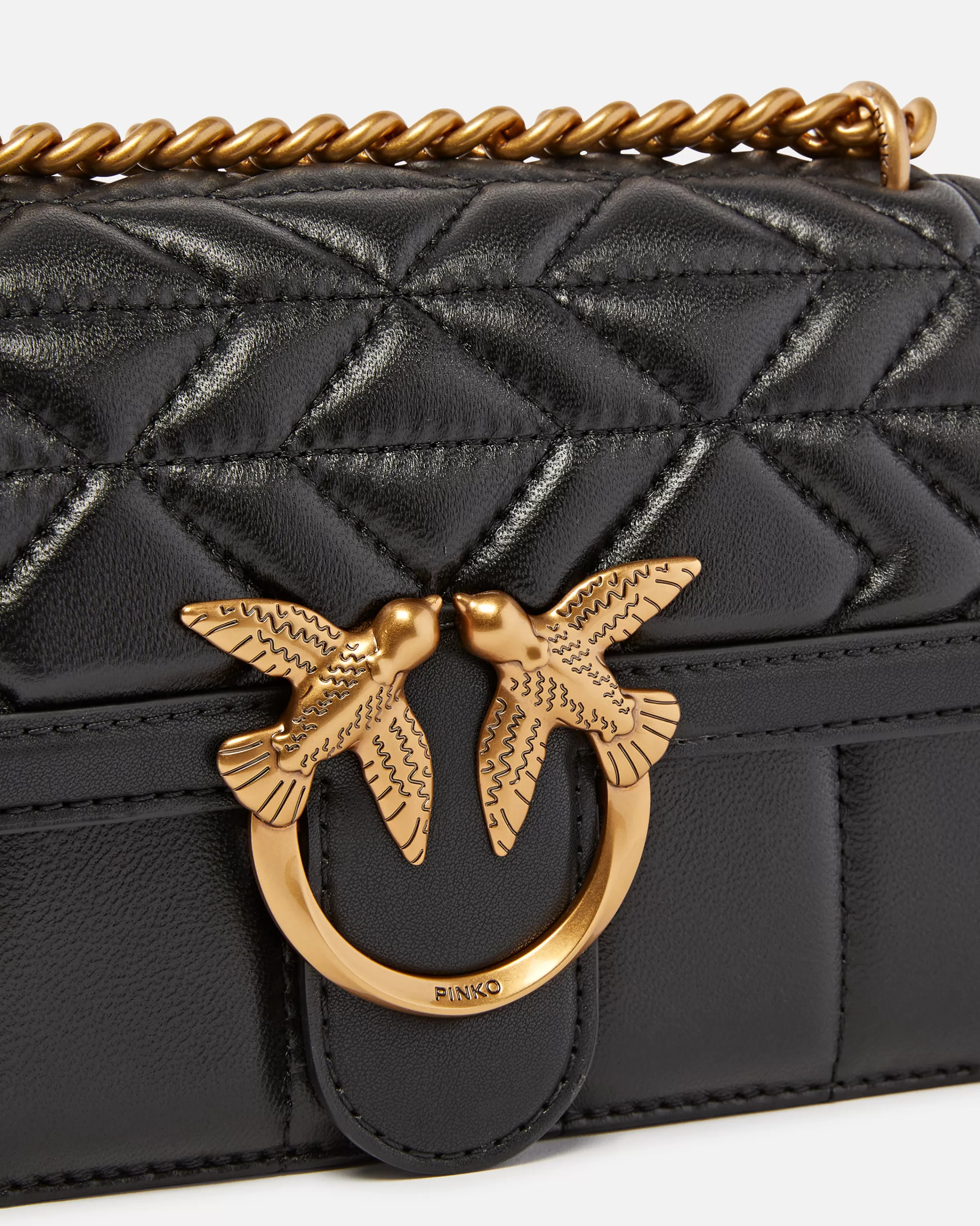 Mini Love Bag small crossbody bag with a rigid structure in quilted nappa leather with a mix of geometric designs. The clasp of the bag is complete with gold metal Love Birds Diamond Cut buckle, while its interior is lined in microfibre suede and includes a handy zipped centre divider pocket. The bag can be worn crossbody or over the shoulder, thanks to the sliding chain that can be doubled over. Activate your PINKO bag: verify the authenticity of your product and access a personalised experience by scanning the Love Birds embroidery on the back of the bag with your smartphone!