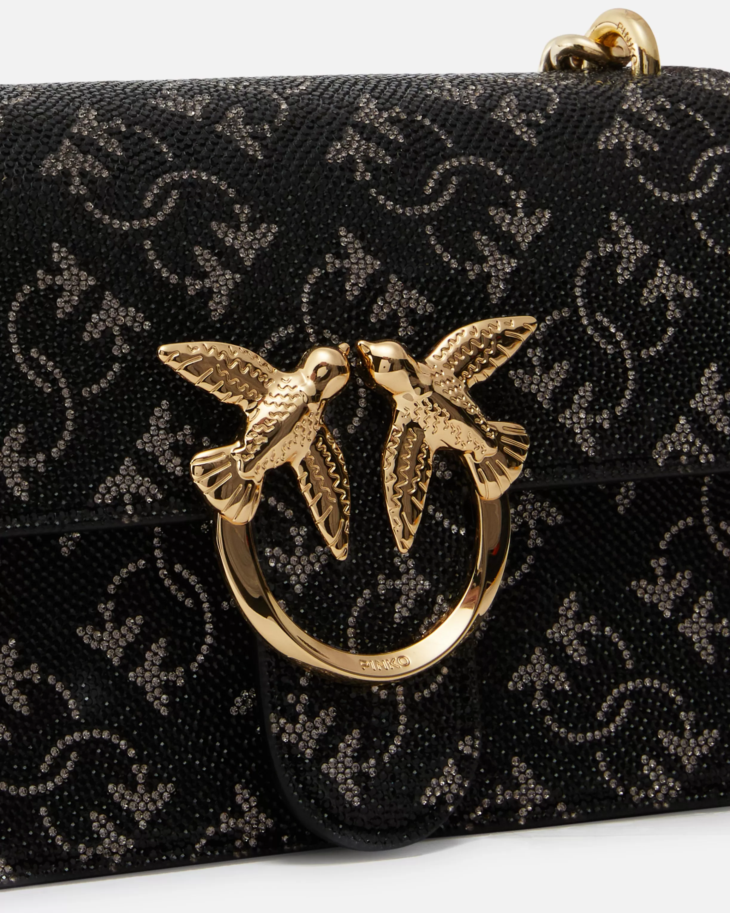 Mini Love Bag rectangular, rigid and structured crossbody bag in smooth leather embellished with shiny rhinestones in two different colours all over, which form the Love Birds Monogram pattern. This special-occasion handbag has a metal chain shoulder strap with an adjustable leather pad, while the microsuede-lined interior features a zipped slip pocket. The fastening is accompanied by the iconic Love Birds Diamond Cut buckle. Activate your PINKO bag: verify the authenticity of your product and access a personalised experience by scanning the Love Birds embroidery on the back of the bag with your smartphone!