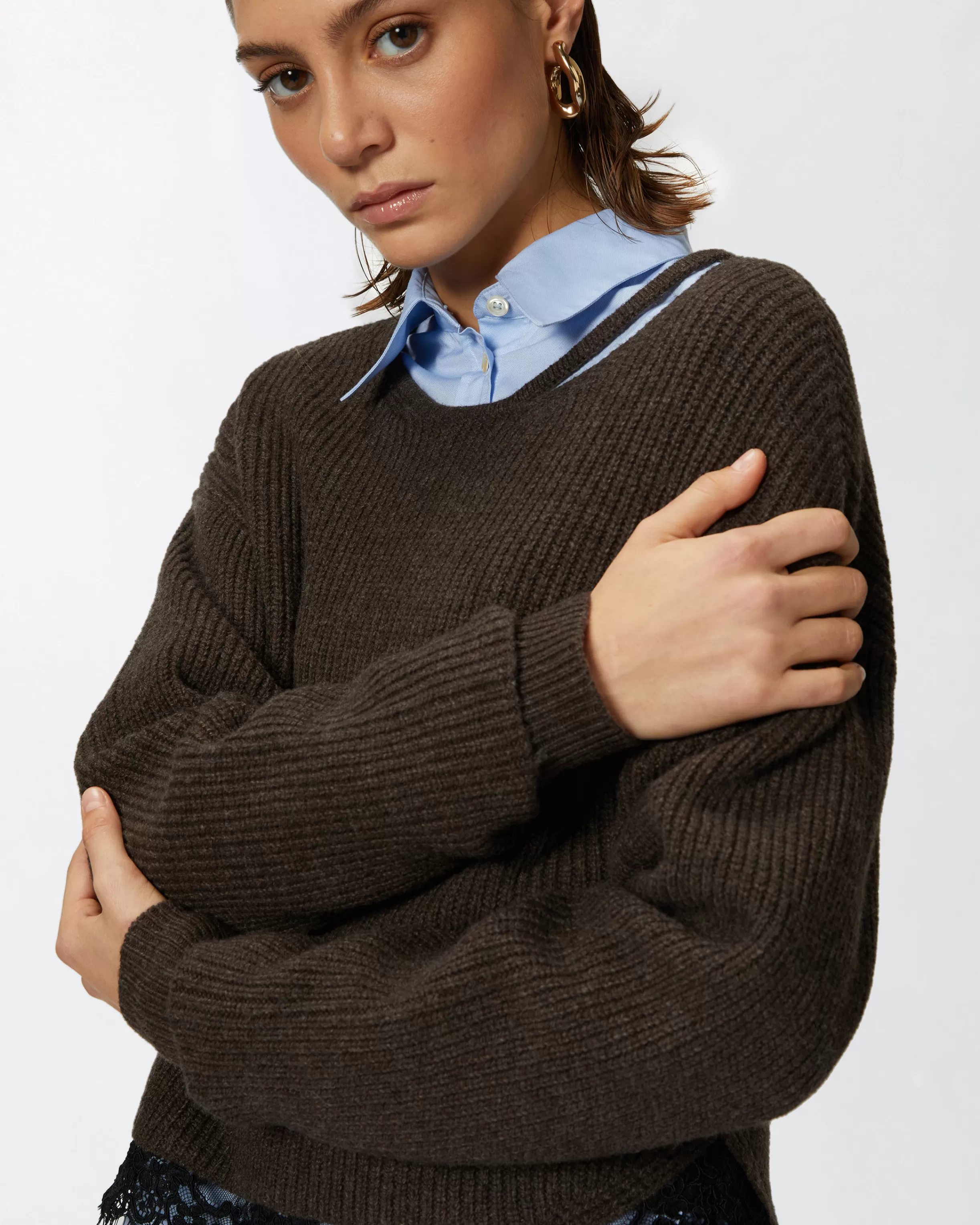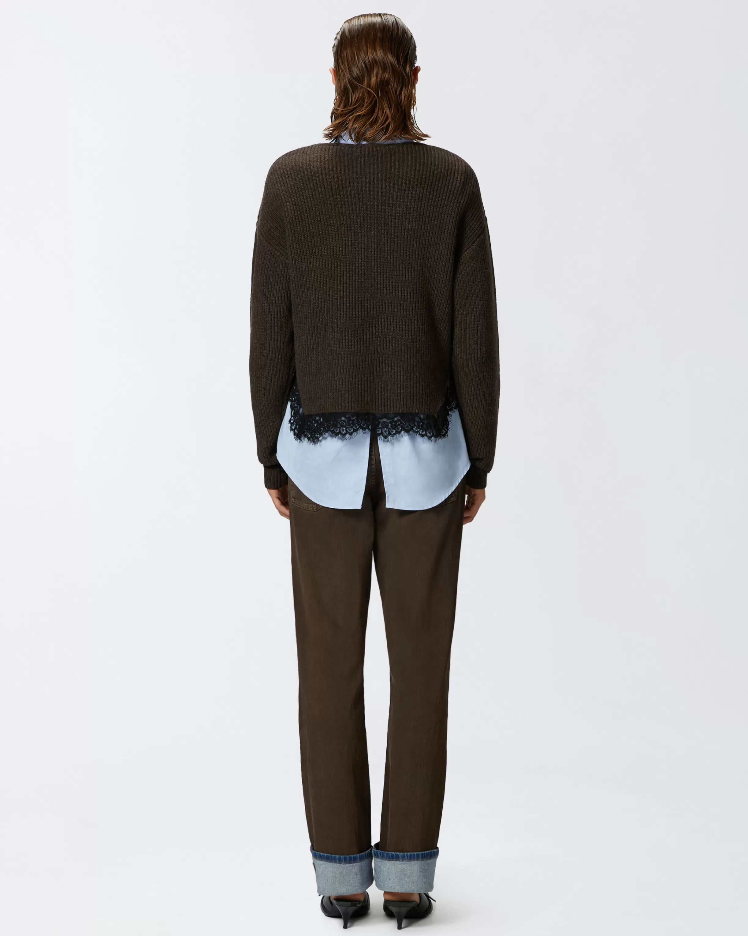 Women’s sweater made of ribbed wool-blend knit, customised with scalloped lace insert at the hem to add a feminine touch. The sweater is a true essential for your daily seasonal looks, and is complemented by cut-out details on the rounded neck and at the ends of the long, low set-in sleeves.