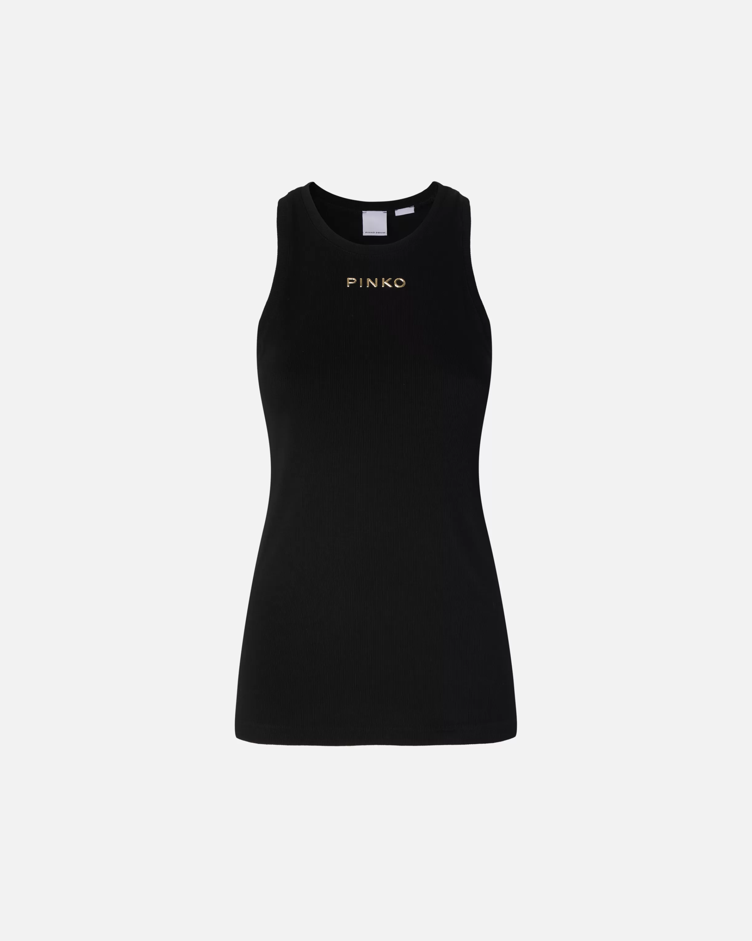 Vest top in ribbed knit cotton fabric. Slim-fitting piece with racerback and custom PINKO logo in the middle on the front.