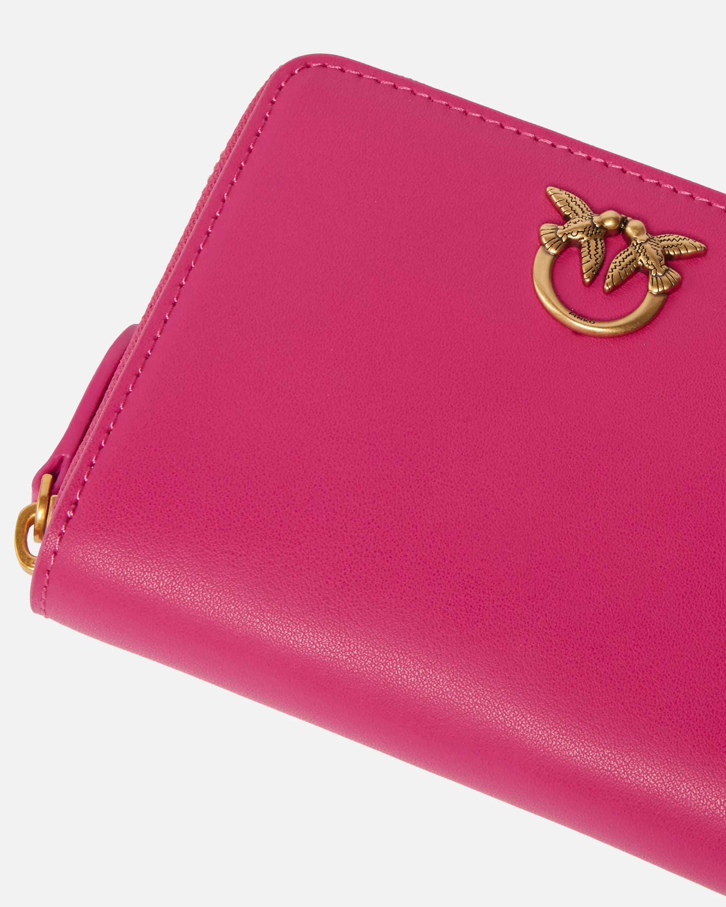 Square-shaped zip-around wallet in soft, silky leather, featuring the Love Birds Diamond Cut plaque on a leather base. P…