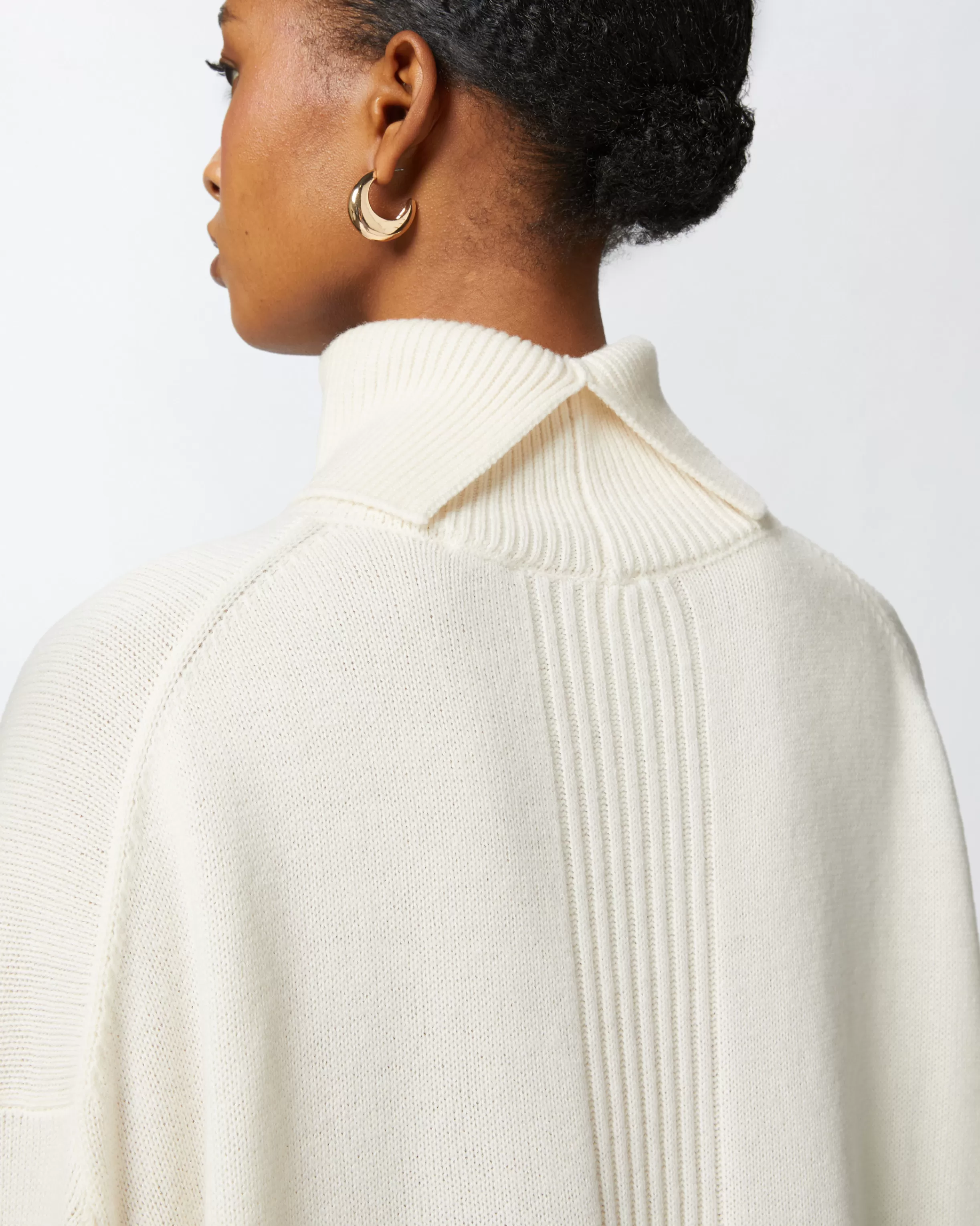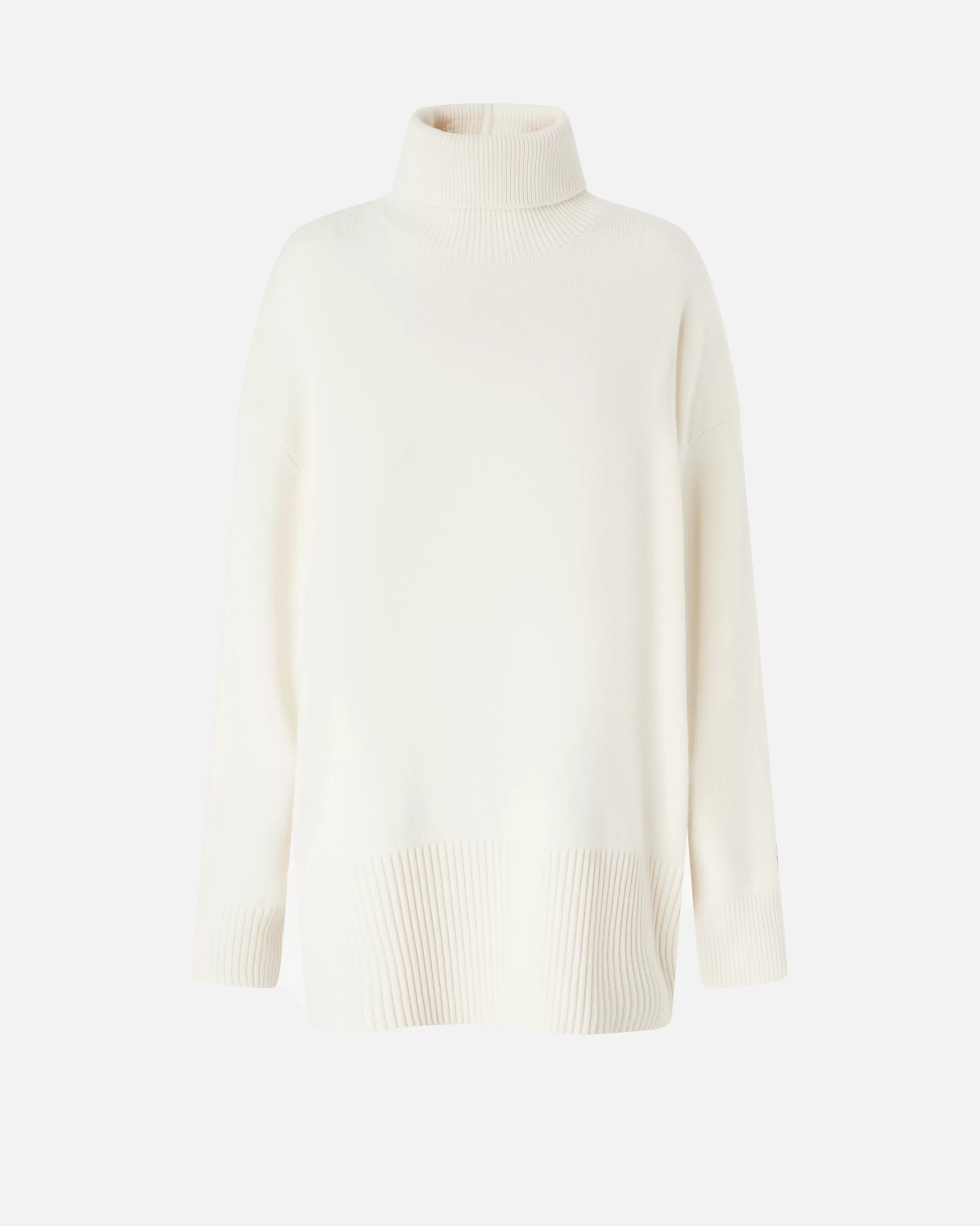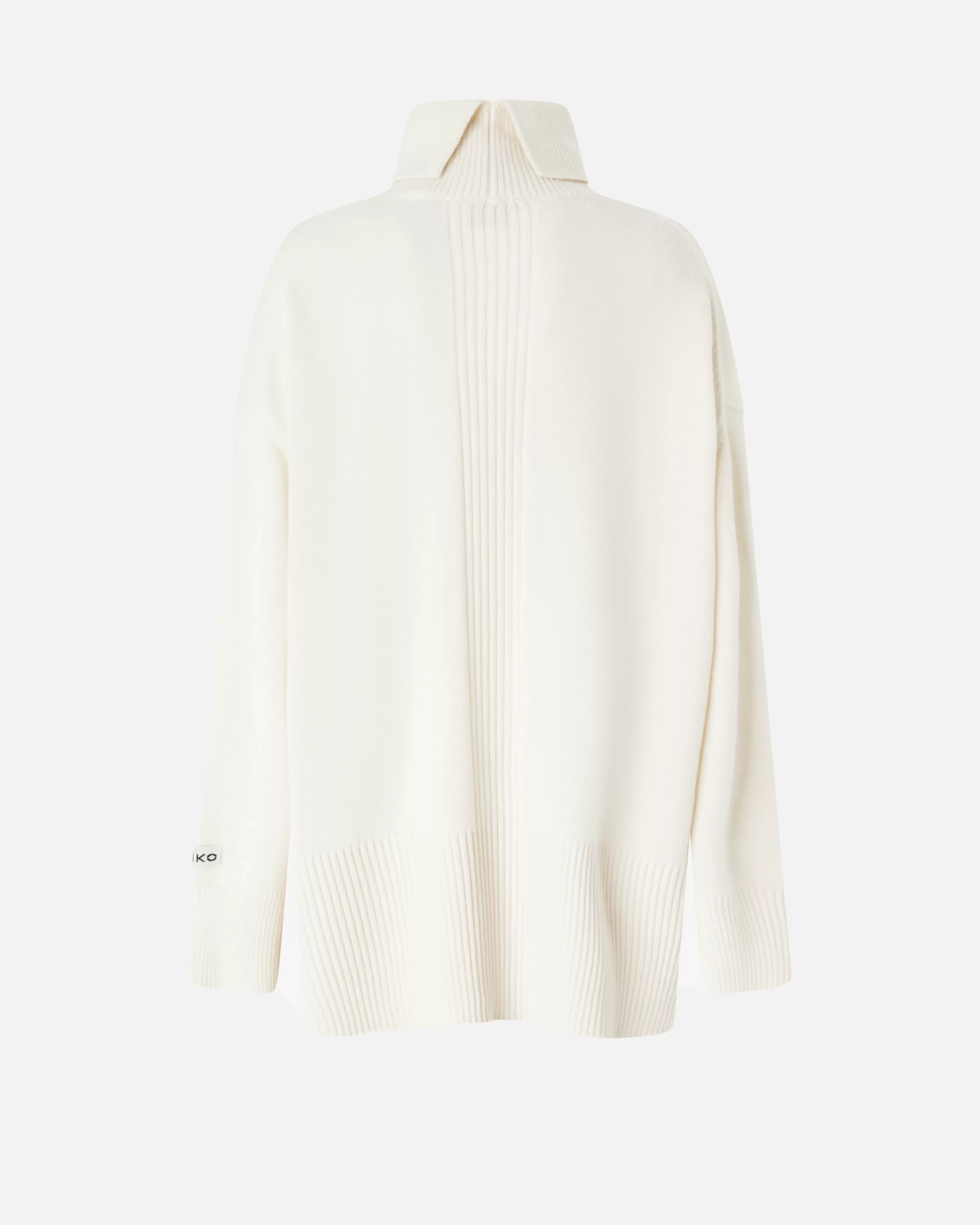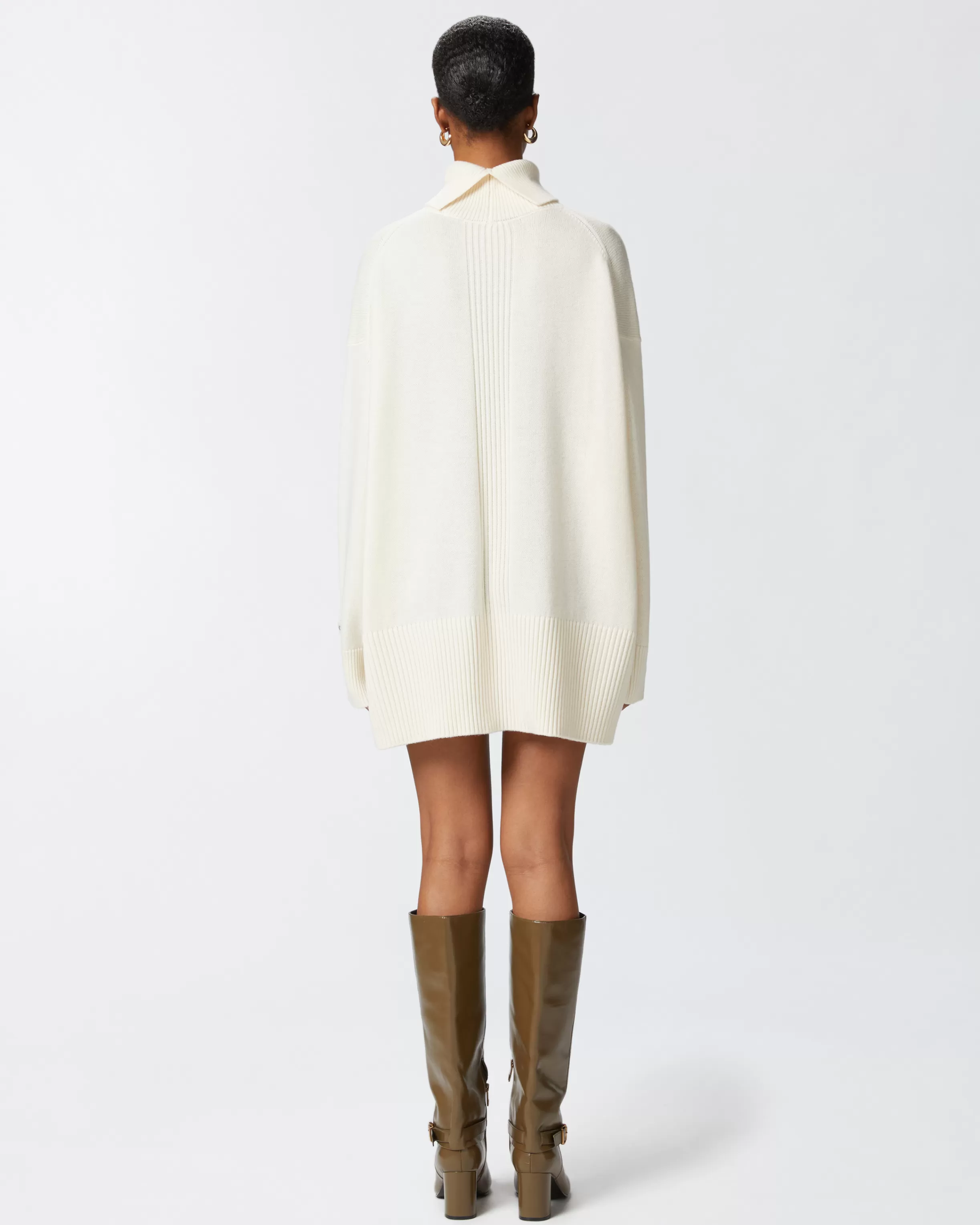 Women’s knit pure wool mini dress with high neck that is open at the back and wide, slightly low set-in sleeves. This soft, enveloping knit mini dress is ideal to wear to any occasion with a pair of knee-high boots.