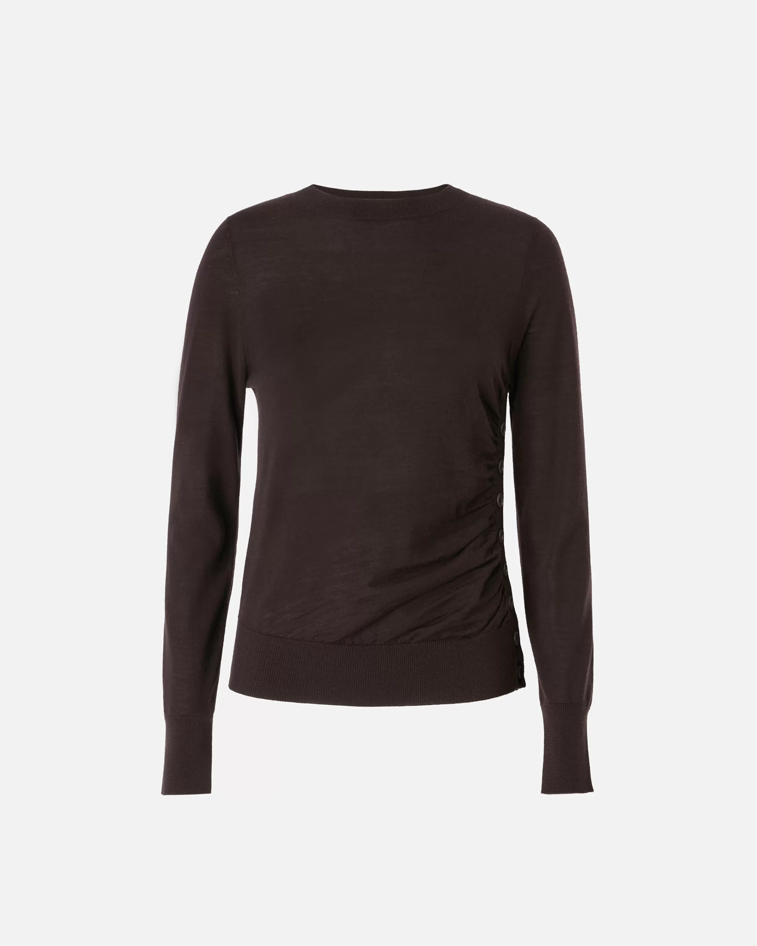 Long-sleeved crew-neck sweater made from soft, lightweight pure wool yarn. The buttons at the side—which can be unfast…