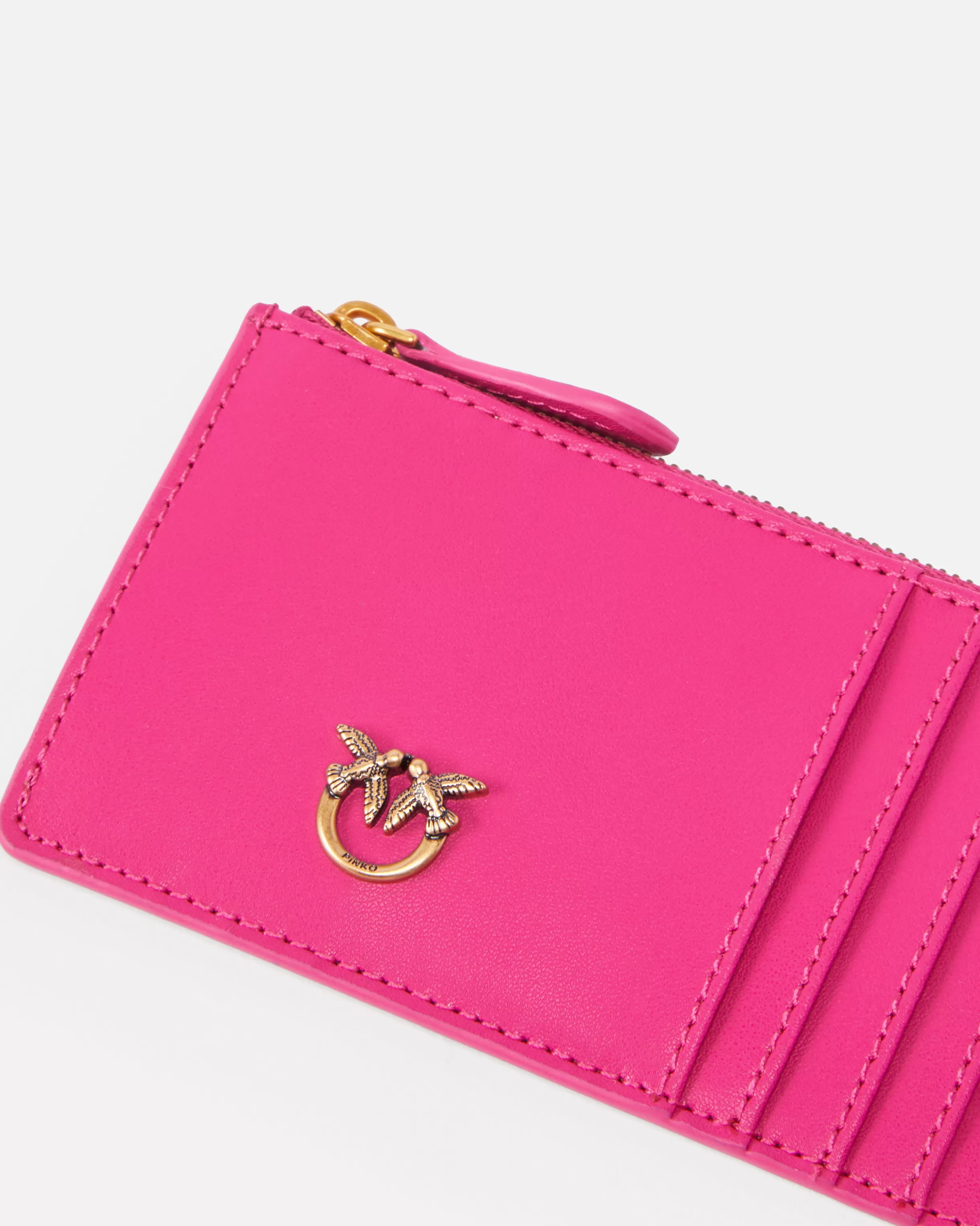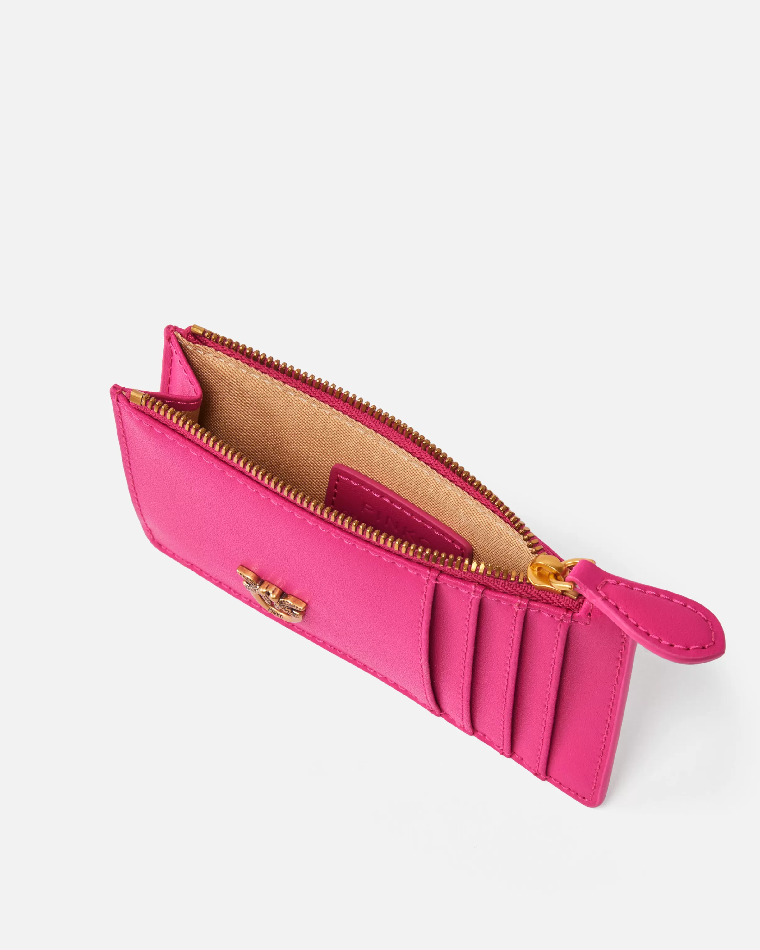 Soft, silky leather card holder. Metal Love Birds Diamond Cut logo plaque embellishment. Polycotton-lined interior. Zip …